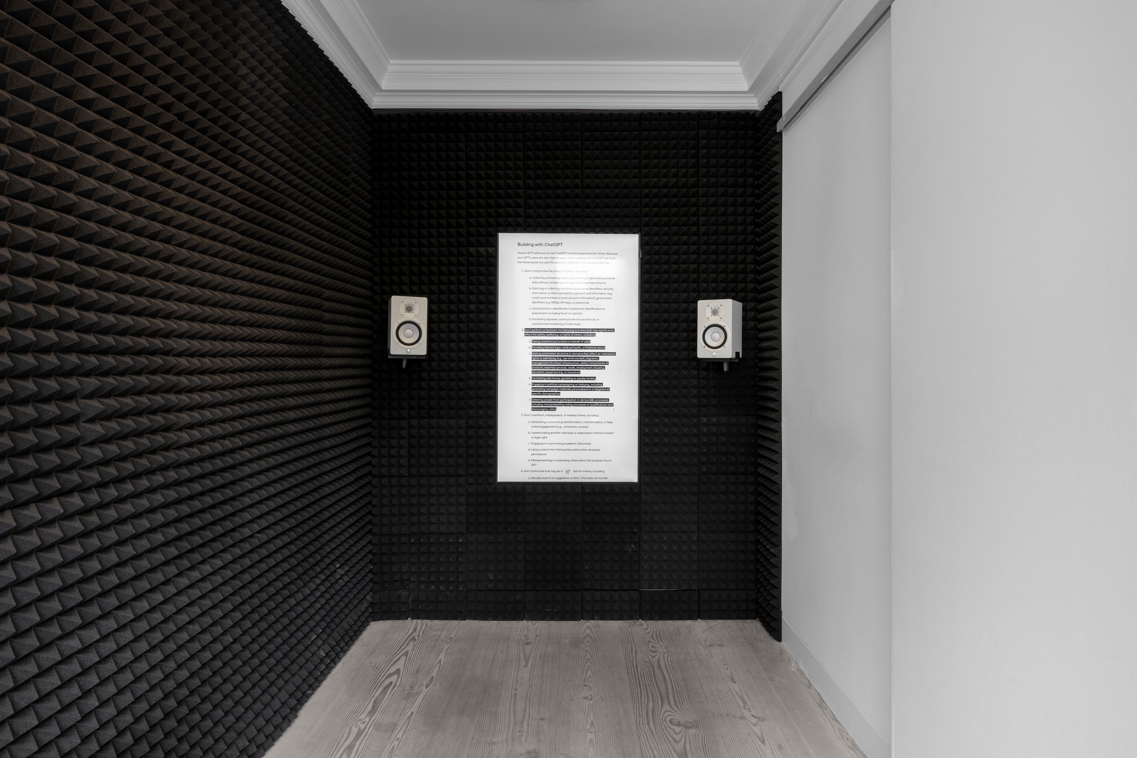 Jake Elwes’ Terms & Conditions Opera: a Legalese Libretto (2024–2025) turns the fine print of corporate AI platforms into an absurdist operatic score. For Elwes, the true content of corporate AI lies not in its generated output – often imitative and derivative – but in the policies, copyrights, and terms that shape its use and demand real human labour and political engagement.