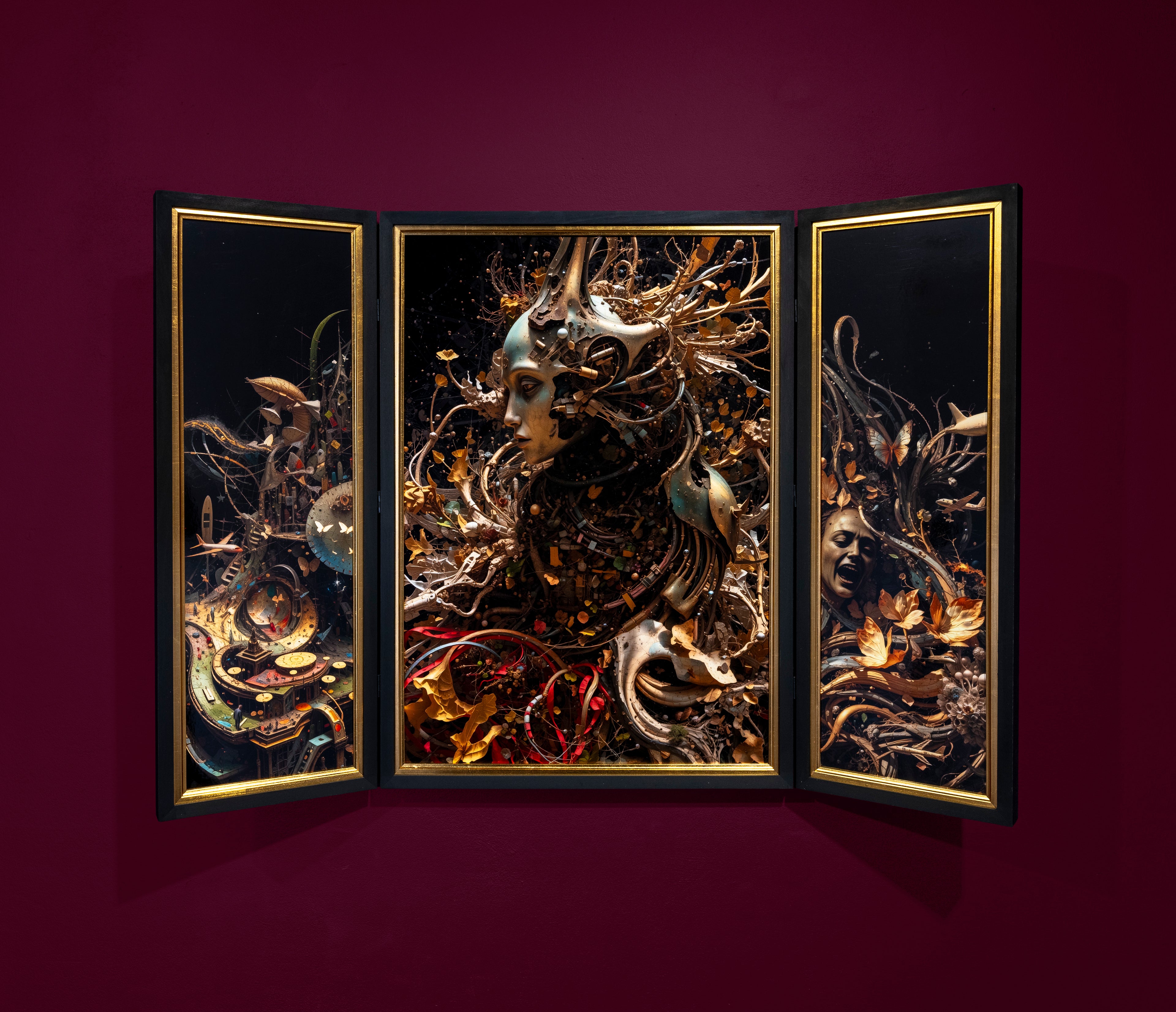 Brendan Dawes’ Altarpiece: Ascension (2025) continues the artist’s series of triptychs that fuse the iconography of church altarpieces with contemporary reflections on AI.Created through meticulously collaged images using the ComfyUI interface, the work’s golden and bronze tones, dramatic lighting, and layered “scenes within scenes” offer both grandeur and unease.