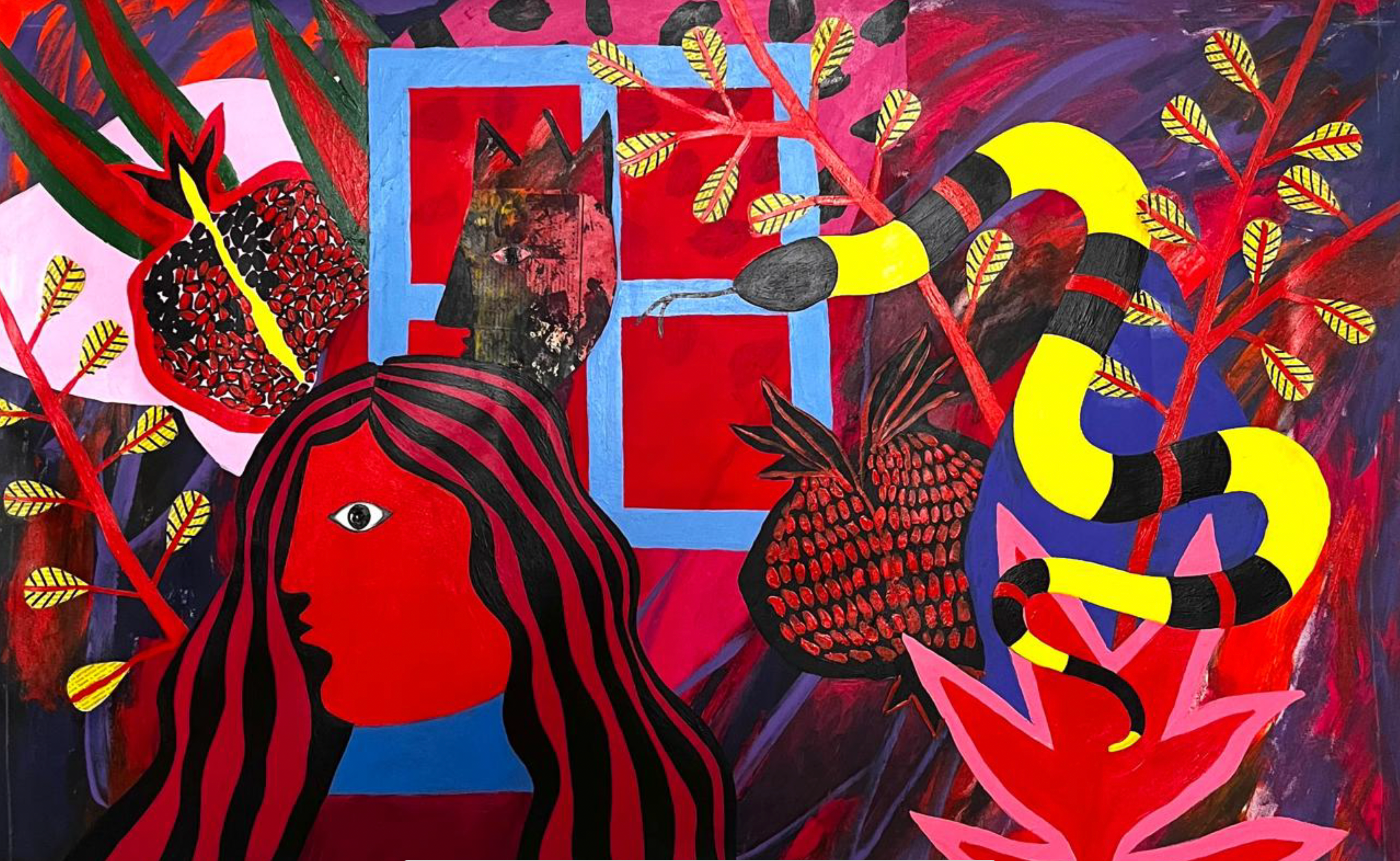 Saadatkhan is a Baku-based artist who graduated from the Fine Arts Faculty in both the Azimzade Art School and the Azerbaijan State Academy of Fine Arts. Her practice spans painting, collage, and pop art, infused with abstract expressionist and pop art sensibilities. Engaging mythology, biblical narratives, and philosophical themes, she resists gendered or socio-cultural constraints, instead using bold, colourful imagery to explore archetypal energies, layered meanings, and encrypted visual forms. Drawing from Azerbaijani artistic heritage, Saadatkhan subtly references traditional carpet weaving and medieval miniature painting through her use of symbolism and structure. Her practice evolves through distinct phases, continually transforming while maintaining a recognisable and coherent visual signature style. Her work has featured in Art Dubai (2025) with Gazelli Art House and a group exhibition Spring Flow (2025), Gazelli Art House, Baku.